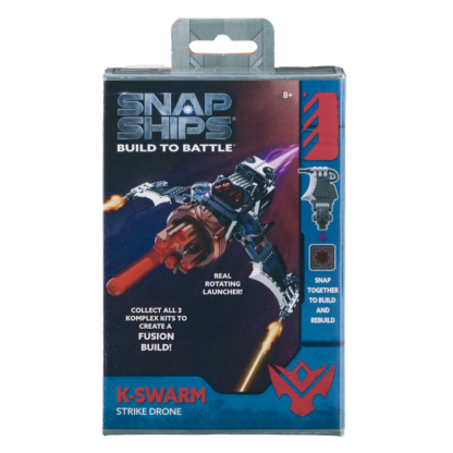 Now YOU can Build to Battle! Snap Ships is a versatile building system for creating multiple crafts with action play, and all sets and pieces are interchangeable, so kids can build however they want. The Snap Ships set for K-Swarm Strike Drone includes instructions for the drone that you assemble yourself and then engage in battle with real shooting weapon play! The K-Swarm Strike Drone is a Komplex drone used for quick takedowns during battles and features a real rotating launcher! When you collect all three Komplex Drones (K-Dive Ambush Drone, K-Crawler Suppression Mech and K-Swarm Strike Drone–each sold separately), you can combine them to build the K-Form Fusion Build!